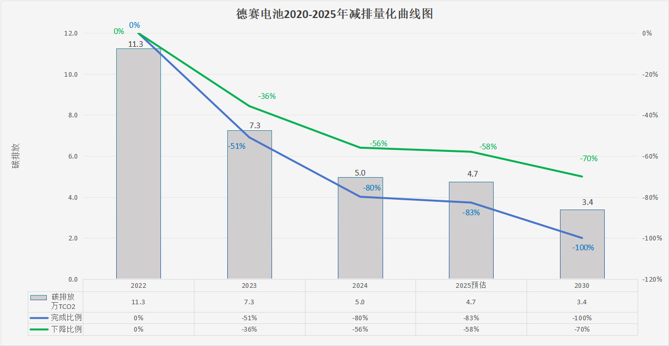 2022年德賽電池(惠南工業(yè)園)的范圍1、2、3碳排放總量約為11.3萬(wàn)噸,德賽電池通過(guò)不懈努力,僅至2024年,公司已成功將碳排放總量削減至約5.0萬(wàn)噸(已完成80%的目標(biāo)),實(shí)現(xiàn)相對(duì)于基準(zhǔn)年碳排放總量56%的顯著減排,2025年預(yù)計(jì)碳排總量約為4.7萬(wàn)噸(預(yù)計(jì)完成83%的目標(biāo)),實(shí)現(xiàn)相對(duì)