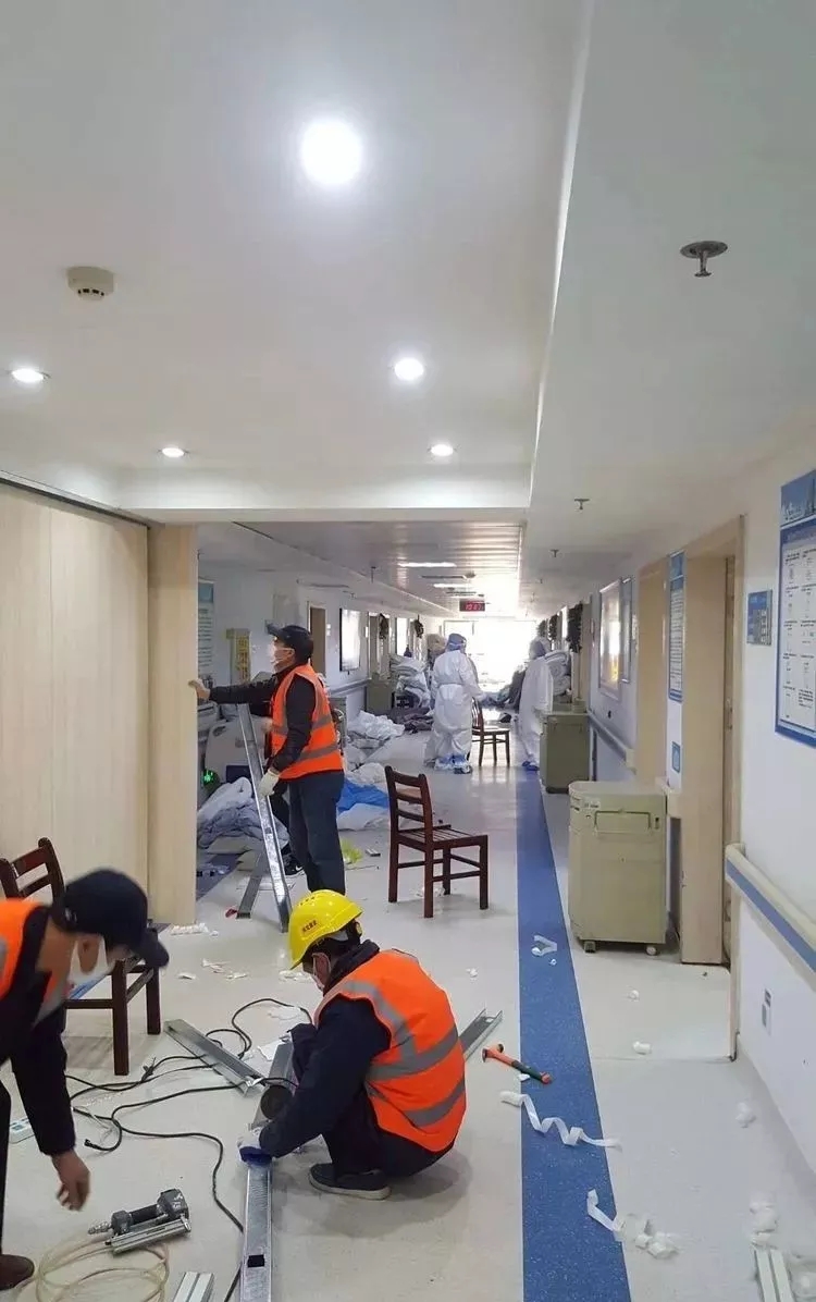 ? ? ? 2月17日下午,在舊樓住院部其余樓層完成消毒之后,項目人員再次緊急前往醫院,進行第二階段的施工,項目人員連軸轉直至第二天清晨。2月18日上午,為了嚴格貫徹上級“寧可讓床等人,也不要讓人等床”的指示,院方決定再新增一棟樓作為備用,在方案確定之后,公司積極響應,同步啟動第三階段施工,由于時間緊、任務重,公司從其他收尾項目抽調了10余名管理人員,60多名工人進行人員補充,確保了新樓舊樓同步施工。