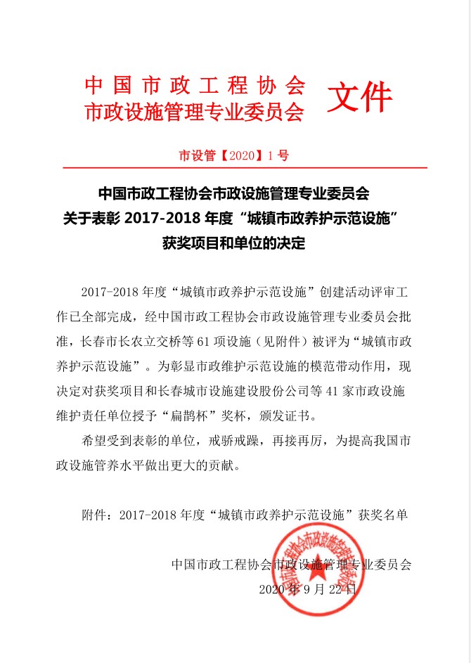 據悉,“扁鵲杯”是中國市政養護的最高獎項,每兩年評選一次,積極提倡預養護思想,保障市政設施維修質量,目的是為了維護市政設施完好,加強科學管理,以期推動市政設施養護維修事業的進步。