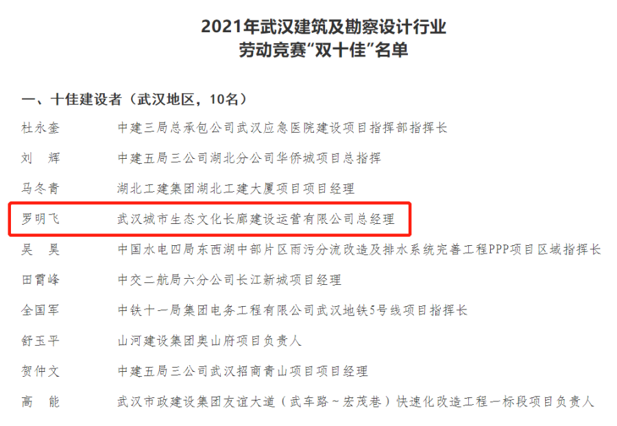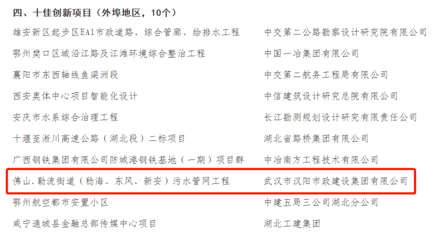 在2021年第七屆武漢建筑及勘察設(shè)計行業(yè)勞動競賽“雙十佳”選樹活動中,羅明飛獲評武漢地區(qū)十佳建設(shè)者,漢陽市政承建的廣東佛山勒流街道(稔海、東風(fēng)、新安)污水管網(wǎng)工程獲評外埠地區(qū)十佳創(chuàng)新項目。