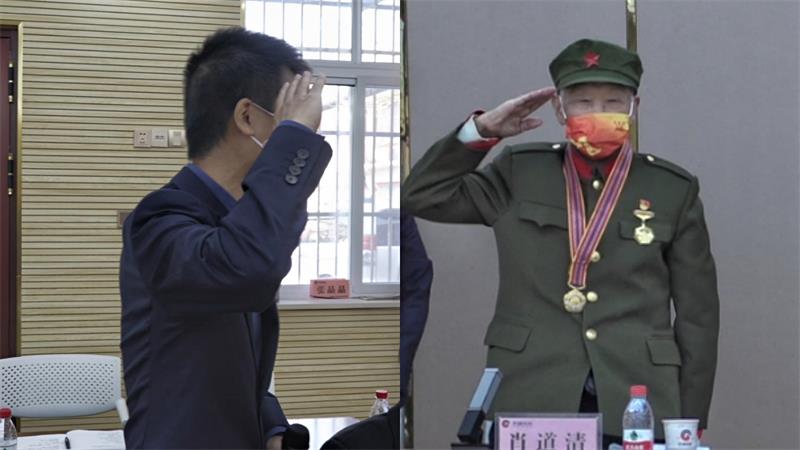 在熱烈的掌聲中,肖道清深情地講起自己在抗美援朝前線(xiàn)作戰(zhàn)的經(jīng)歷。16歲的他積極響應(yīng)國(guó)家號(hào)召,從武漢奔赴東北,到有“人民空軍的搖籃”之稱(chēng)的東北民主聯(lián)軍航空學(xué)校進(jìn)行學(xué)習(xí),光榮地成為一名空軍塔臺(tái)的指揮員,與戰(zhàn)友跨過(guò)鴨綠江,一起爬冰臥雪、在零下三十多度的戰(zhàn)場(chǎng)上,枕戈待旦、奮勇搏殺。說(shuō)到最后,肖道清激動(dòng)地舉起手,敬了一個(gè)標(biāo)準(zhǔn)的軍禮。