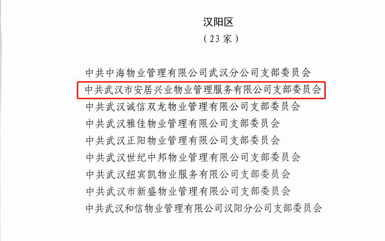 近日,中共武漢市物業(yè)行業(yè)委員會公布《2021年武漢市物業(yè)行業(yè)基層黨組織示范點名單》,漢陽市政安居興業(yè)公司黨支部名列其中。經(jīng)各區(qū)物業(yè)行業(yè)黨委推薦報送,武漢市物業(yè)行業(yè)黨委審核評定,全市共有186個基層黨組織被命名為“2021年武漢市物業(yè)行業(yè)基層黨組織示范點”。