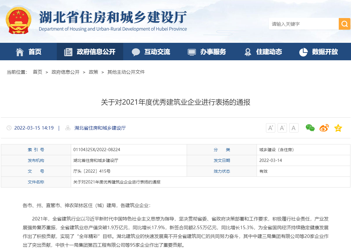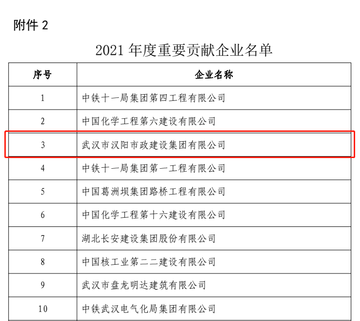 ? ? 3月15日,湖北省住建廳公布115家優(yōu)秀建筑業(yè)企業(yè)名單,揭曉2021年度突出貢獻企業(yè)和重要企業(yè)評選結(jié)果,漢陽市政獲評“2021年度重要貢獻企業(yè)”,獲通報表揚。