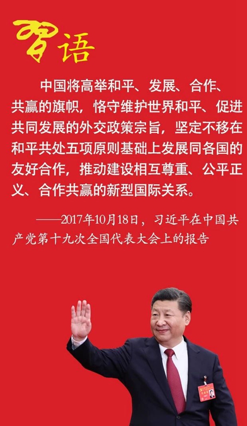 中國將高舉和平、發展、合作、共贏的旗幟,恪守維護世界和平、促進共同發展的外交政策宗旨,堅定不移在和平共處五項原則基礎上發展同各國的友好合作,推動建設相互尊重、公平正義、合作共贏的新型國際關系。