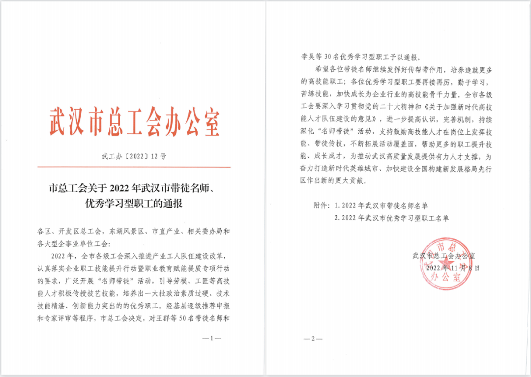 師徒結對傳匠心,青藍相接鑄輝煌。2022年11月8日,根據武漢市總工會辦公室發布的《市總工會關于2022年武漢市帶徒名師、優秀學習型職工的通報》,漢陽市政羅明飛、李子豪、陳文獲評“武漢市帶徒名師”,林志剛、易曉輝獲評“武漢市優秀學習型職工”。