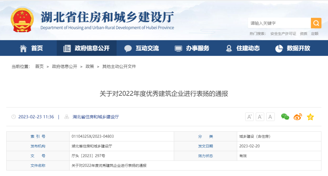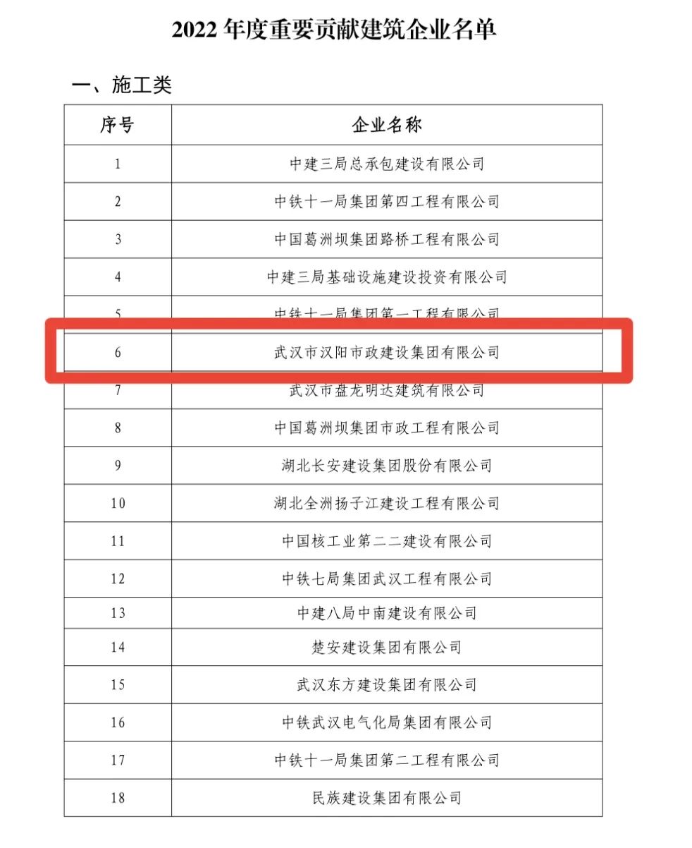 2月23日,湖北省住房和城鄉(xiāng)建設(shè)廳召開全省建筑業(yè)發(fā)展與管理工作會議,會上通報(bào)表揚(yáng)26家突出貢獻(xiàn)企業(yè)和114家重要貢獻(xiàn)企業(yè)。漢陽市政榜上有名,獲評“湖北省2022年度重要貢獻(xiàn)建筑企業(yè)”。