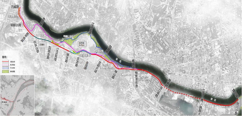 漢水碧道改造提升工程包含新建及提升琴斷口水廠上游至月湖橋段碧道,碧道總長約5.77km,標準段寬4.5m,面積約3.27萬㎡;修整漢江村民垸堤,重建堤頂道路長約1.85km;在碧道沿線和琴韻碼頭等8個節點新建和提升綠化約23.59萬㎡;提升晴川閣-琴川小路段1.53km碧道及綠化約1.74萬㎡;新建漢水公園段護岸。同步建設驛哨、給排水、亮化、公共廣播及監控等配套設施。