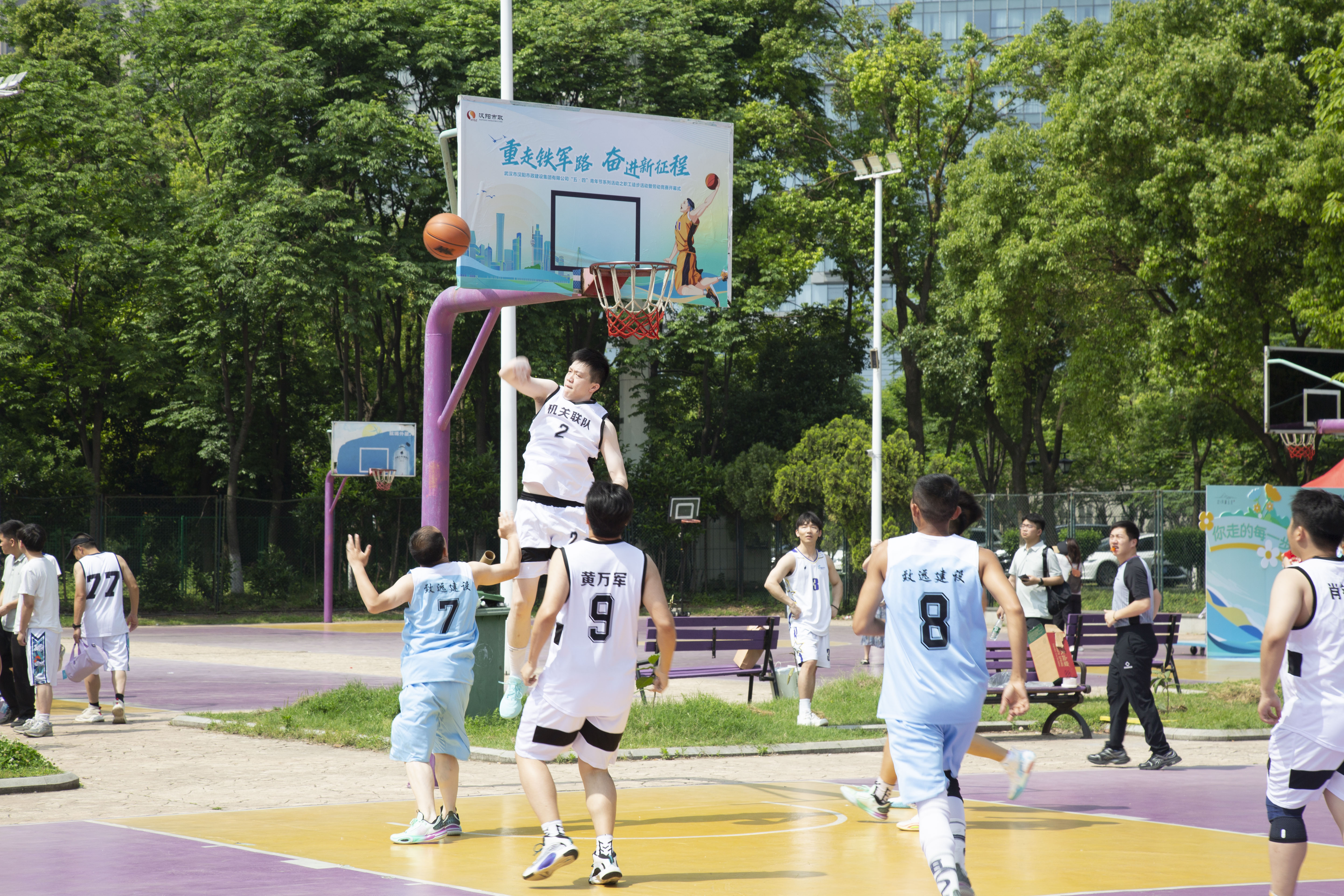 王智高為籃球賽開球。第一場機關聯隊對陣致遠建設隊,揭幕戰正式打響,雙方隊員對抗交鋒,默契地傳球、精準地投球,盡情地展示著精彩的籃球技術,打出一波接一波的小高潮。漢陽市政第十四屆職工籃球賽開幕式圓滿落幕。