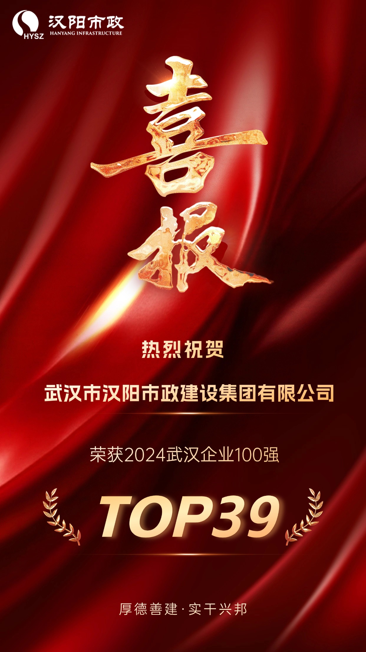 9月27日,武漢企業聯合會、武漢企業家協會和武漢發展戰略研究院聯合發布《2024武漢企業100強、制造業企業100強、服務業企業100強分析報告》。漢陽市政榮登武漢企業100強榜單第39位,相較上年再升7位!截至目前,漢陽市政已連續8年上榜武漢企業100強。